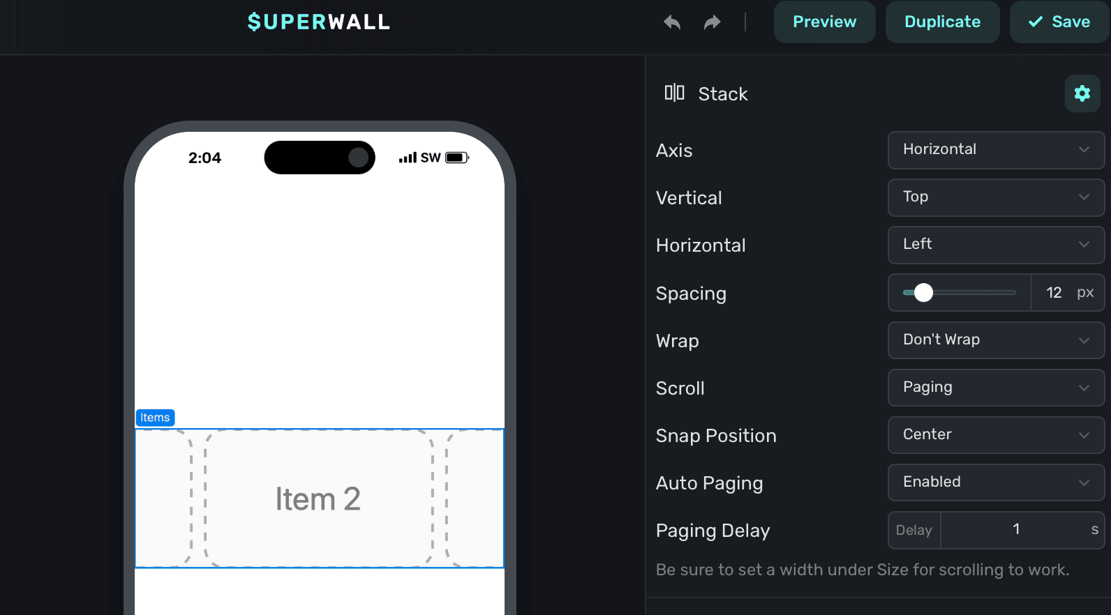 Snap Positionproperty is set toCenter. Editable. Auto Pagingis set toEnabled. Editable.- Finally,