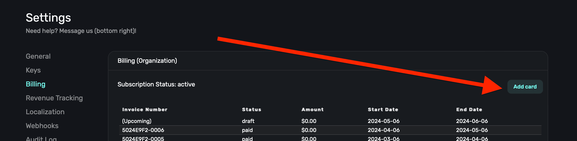 To enter in a credit card for payments, click the Add Card button above the invoice section: