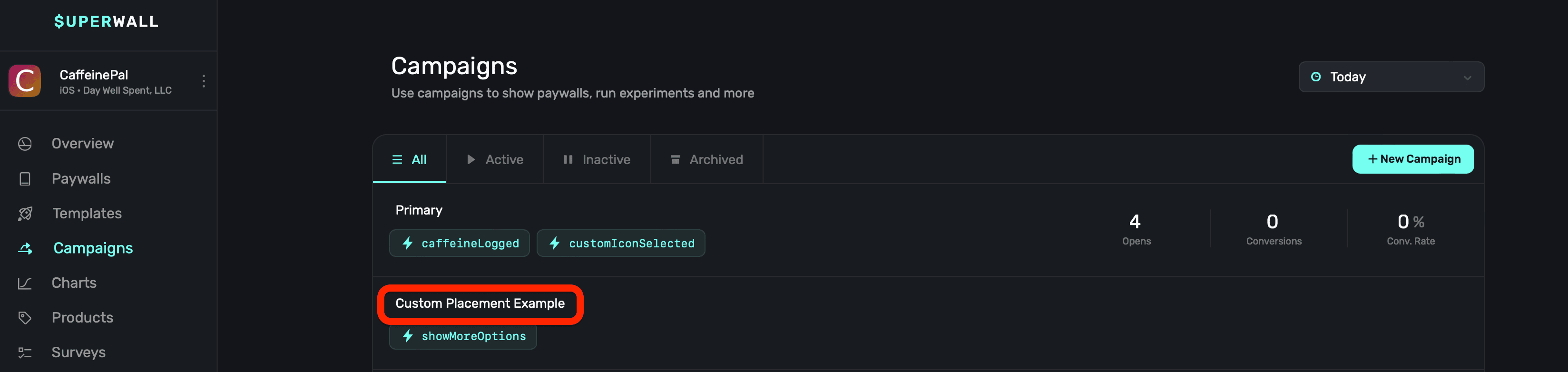 Create a new campaign specifically for this purpose, here β it's called "Custom Placement Example":