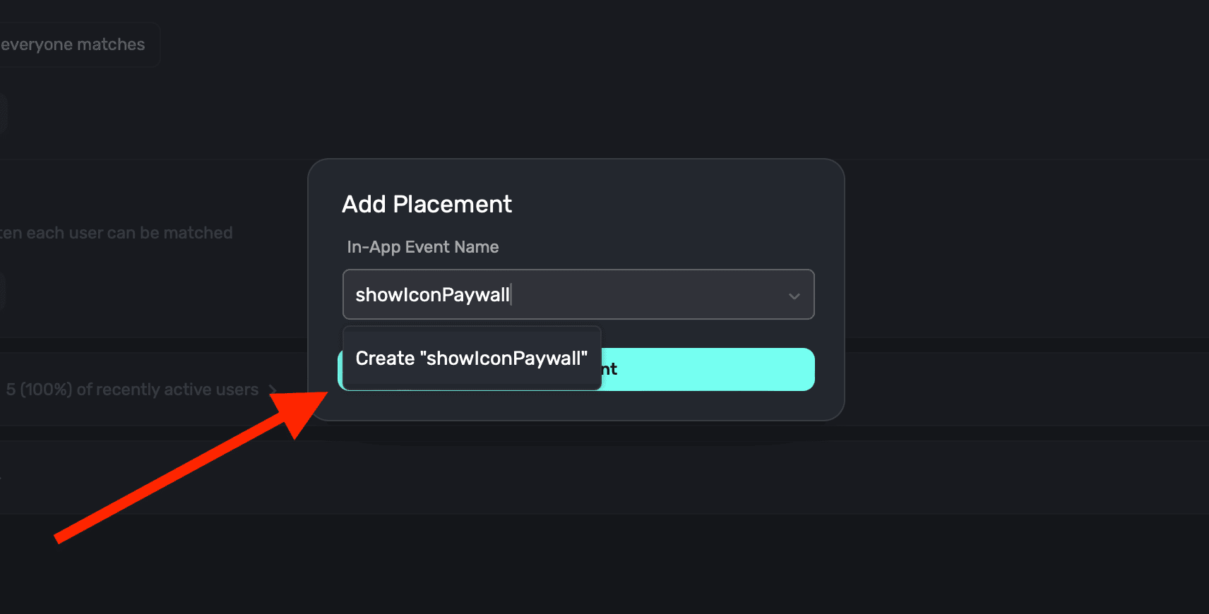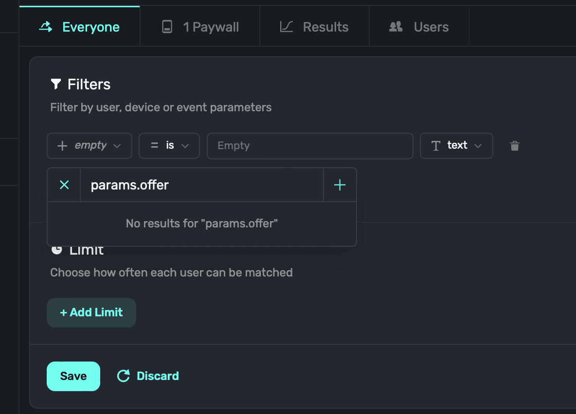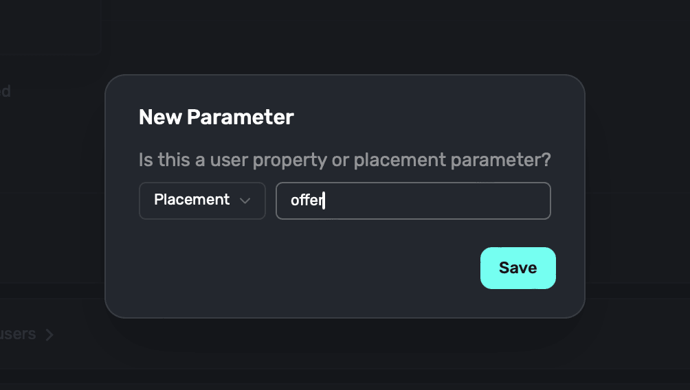 Superwall will ask what type of new parameter this is β choose Placement and enter the parameter name once more (i.e. "offer"). Click Save: