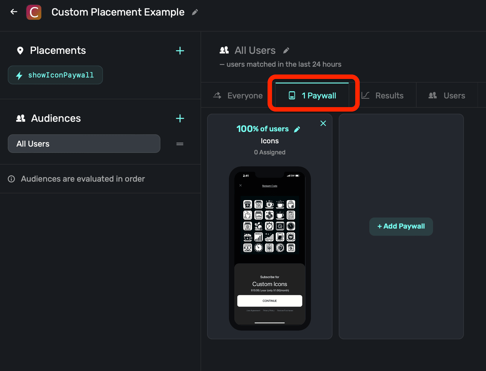 They both have the same idea, though. You create a new campaign specifically for this purpose, attach a paywall and either add a filter (for deep linking) or a new placement (for custom placements) to match users to it.