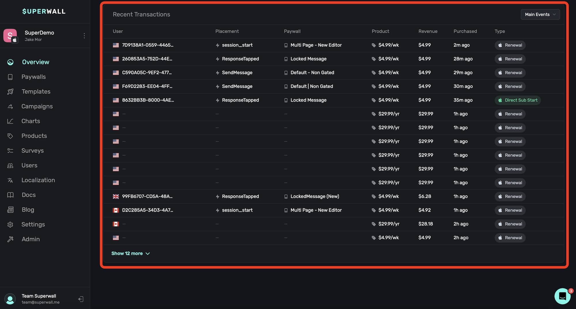 Keep in mind that Superwall displays transaction events based on the moment a server notification is received from the relevant store front. That means that the timing of the event may not necessarily be right when it actually occurred.