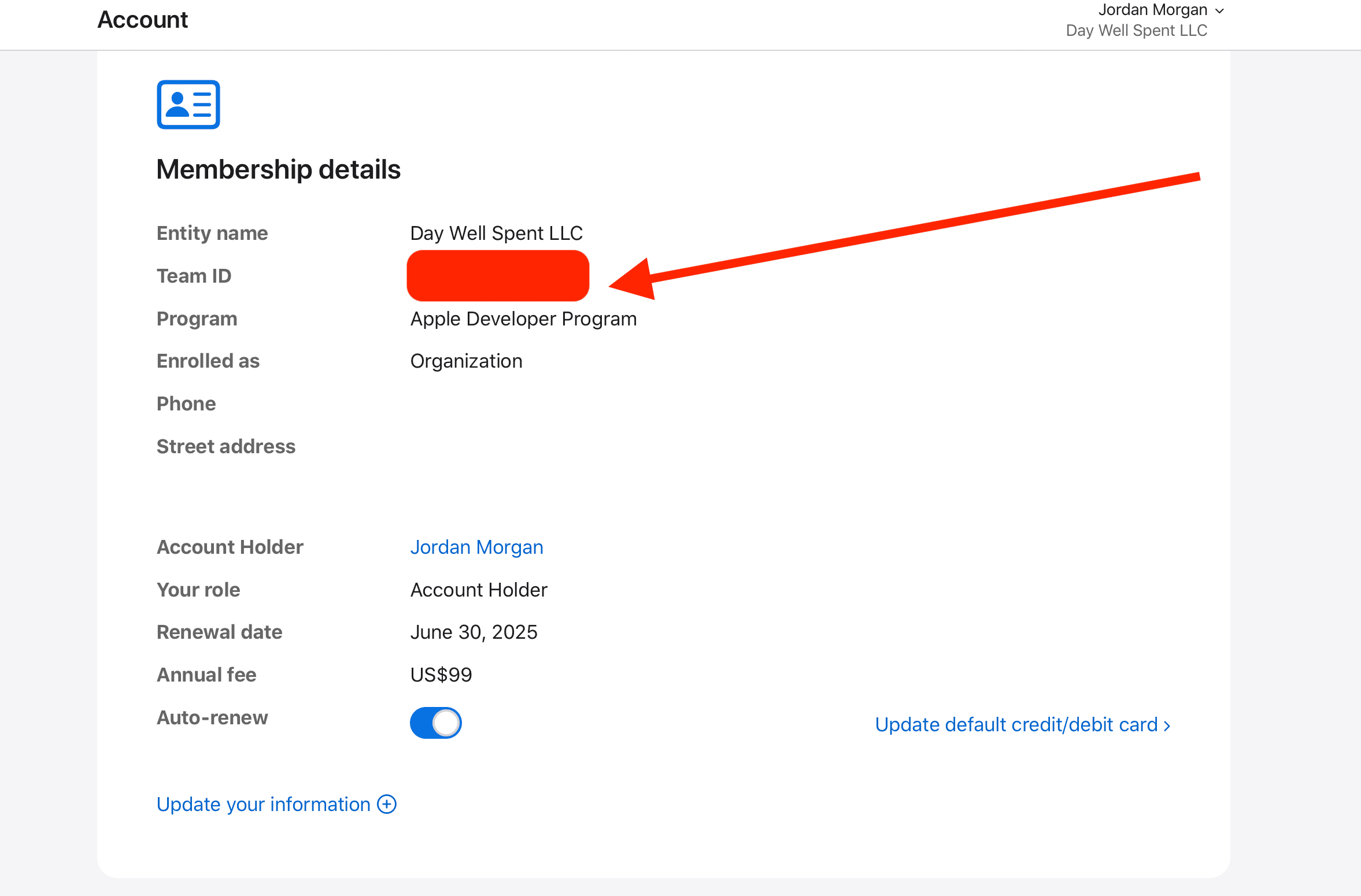 - Team ID: The team ID that your iOS app belongs to. To find this, visit Apple Developer -> Account -> Membership details -> Team ID. It's obscured here, but it'll be where the arrow points in the image below: