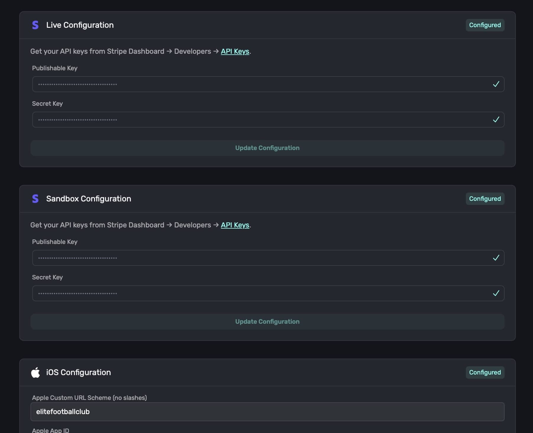 Once you've filled out all of these fields, you should see Configured for each section: